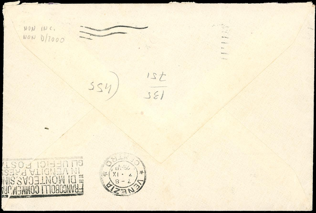 1929 - 50 cent. Imperiale, I tiratura (251), bordo di foglio inferiore con numero di cilindro '102', perfetto, su busta da Trieste 6/9/1929 a Venezia. Il numero di cilindro inferiore era presente solo sulla primissima tiratura dei valori da 50 cent. e 1,25 lire. Rarissimo uso postale. Ferrario, Sorani.