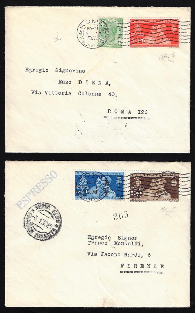 1930 - Nozze di Umberto, serie completa (269/271), su due buste da Roma 8/1/1930, primo giorno d'emissione a Roma/Firenze. Non comuni.