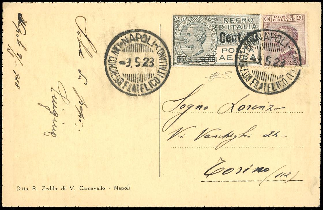 1928 - 50 cent. su 60 cent., 20 cent. Michetti (A8,204), perfetti, su cartolina da Napoli 9/5/1923, annullo del XV Congresso filatelico italiano, a Torino.