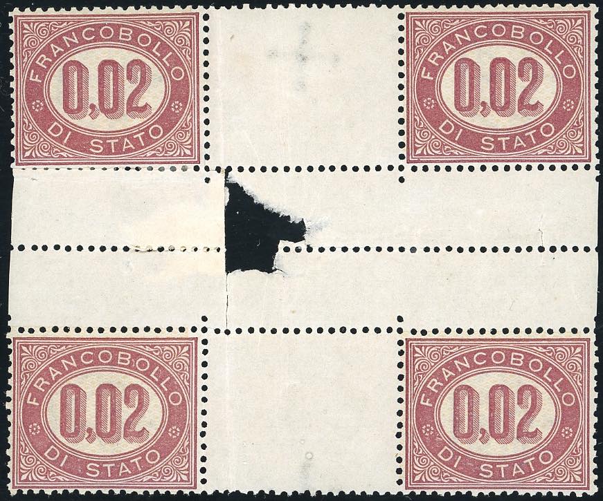 1875 - 0,02 lire Servizio (1), blocco di quattro comprendente sia l'interspazio verticale che quello orizzontale, gomma originale/integra, buono stato. Rarissimo, probabilmente unico.
