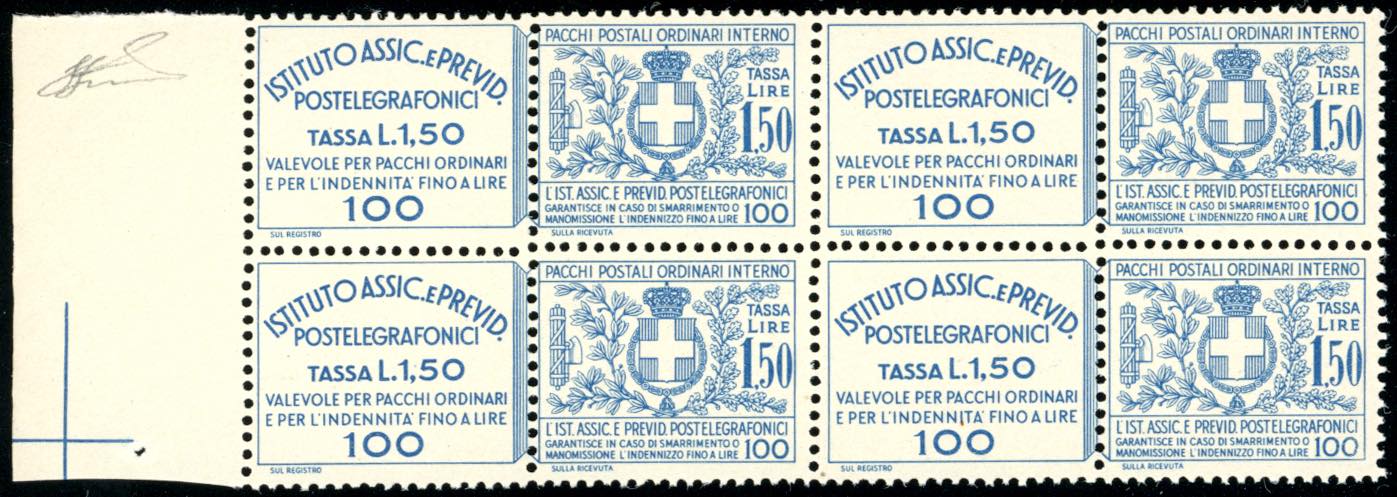 1936 - 1,50 lire Istituto Assicurazioni (17), blocco di quattro, bordo di foglio, gomma originale integra, perfetto. Ferrario.