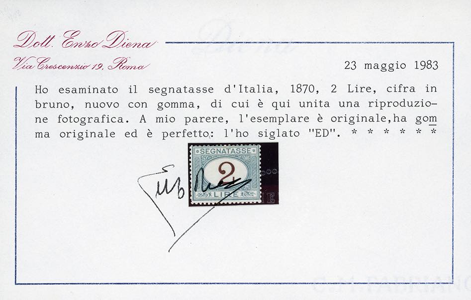 1870 - 2 lire azzurro chiaro e bruno (12), nuovo, gomma originale, perfetto. Molto fresco e buona centratura. Cert. E.Diena.
