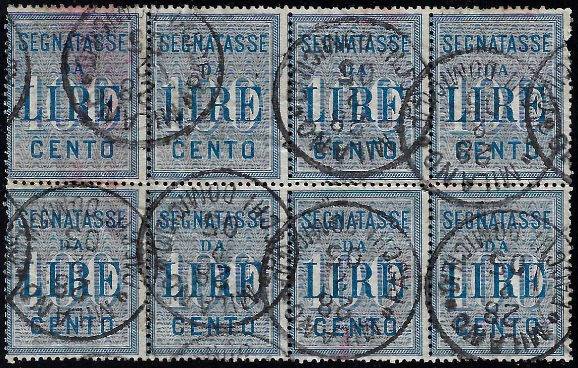 1903 - 100 lire azzurro (32), blocco di otto esemplari usati, qualche imperfezione. Molto raro!