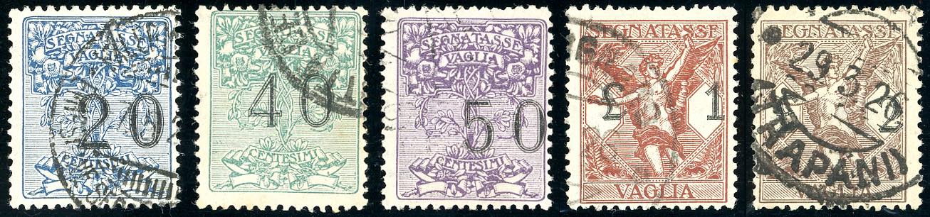 1924 - 20 cent., 40 cent., 50 cent., 1 lira, 2 lire, tutti con cifre fortemente spostate (1ba, 2, 3b, 4b, 5ba), usati, perfetti. Tre cert. Raybaudi e uno E.Diena.