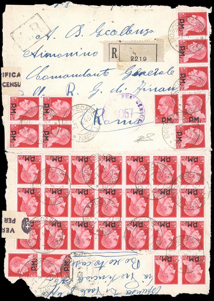 1945 - 20 cent. soprastampato PM, 35 esemplari (4), ottimo stato, in affrancatura recto-verso su busta raccomandata da Bosco Trecase ... Leggi tutto