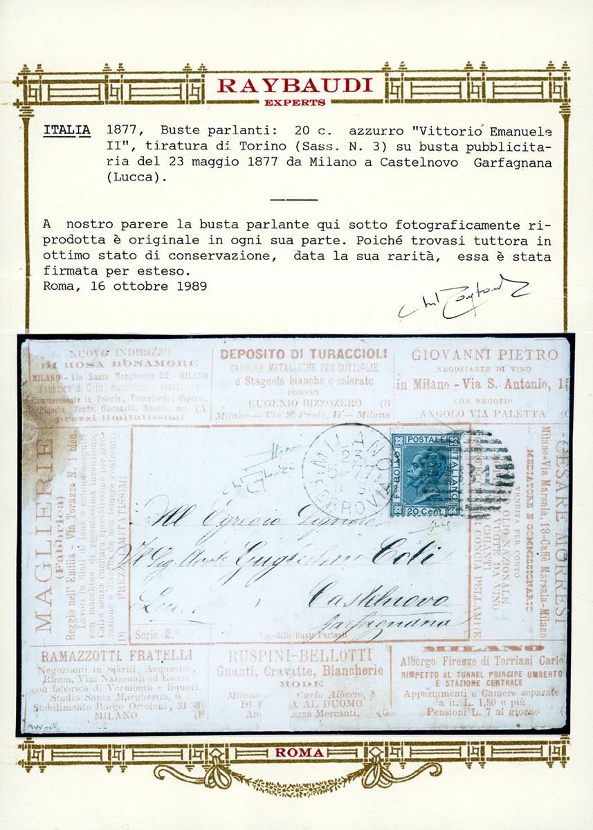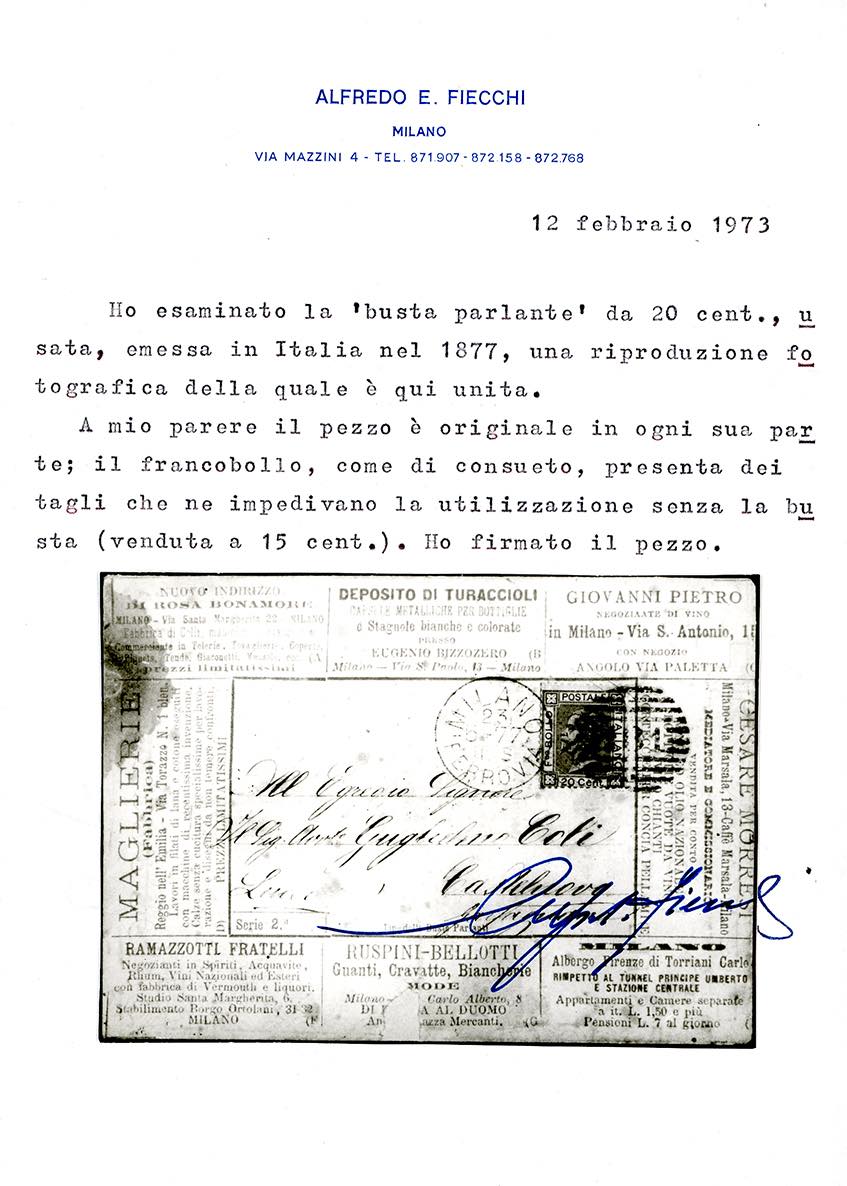 BUSTE PARLANTI CON NUMERO DI SERIE 1877 - 20 cent. azzurro (T26), su busta parlante con numero di serie e testi stampati in arancio (2), da Milano 23/571877 a Castelnuovo Garfagnana. Il francobollo presenta, come sempre, i consueti tagli di rasoio, ad evitarne una possibile asportazione, senza che costituiscano un difetto. Estremamente rara. Sorani, cert. E.Diena, Raybaudi e Fiecchi.