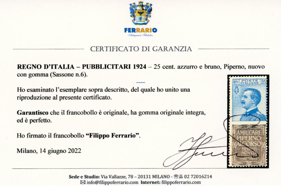 Lotto 1746 - 1924 - 25 cent. Piperno (6), gomma originale integra, ...