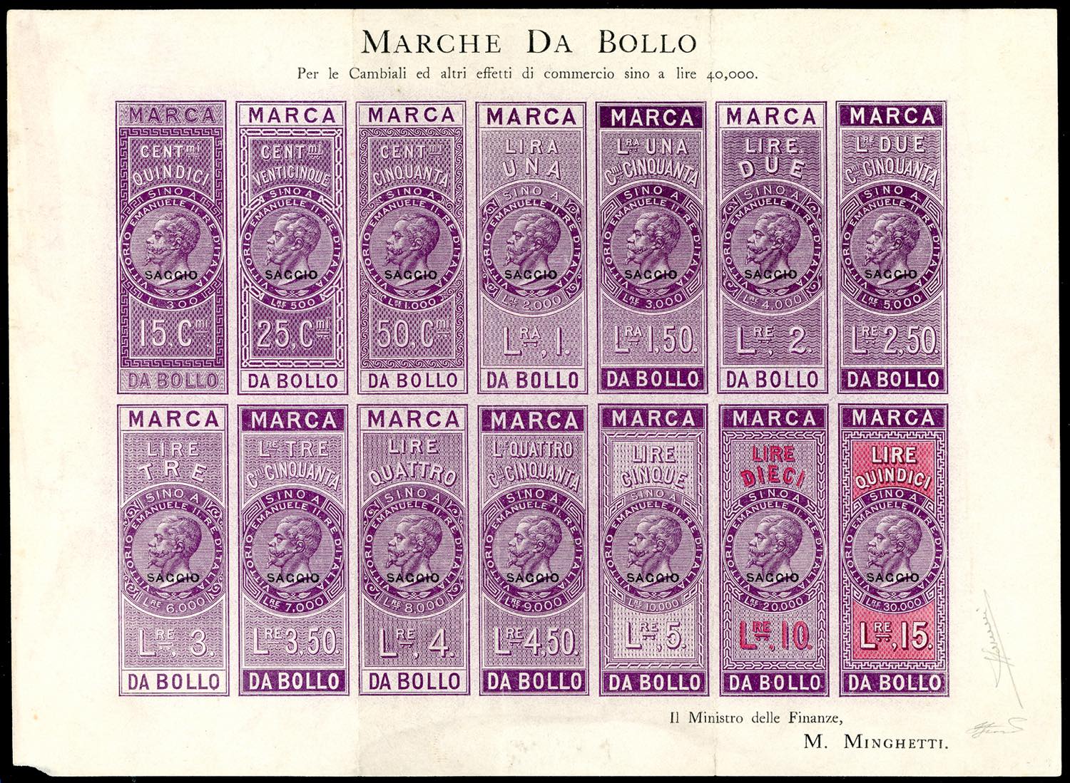 1863 - Foglietto contenente 14 prove di marche da bollo per cambiali, di valore diverso, tutte soprastampate "saggio", senza gomma come sempra, due pieghe verticali che non interessano gli esemplari. Sorani, Ferrario.