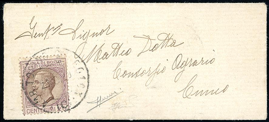 1929 - 20 cent. marca da bollo "Tassa di bollo scambi commerciali", perfetta, su piccola busta dell'ambulante Torino (?) 21/8/1929 a Cuneo, timbrino di distribuzione al verso. L'uso postale di questa marca è molto raro. Sorani, cert. Ferrario.