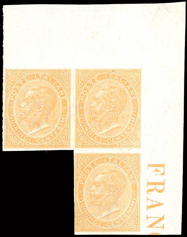 1863 - 15 cent. De La Rue, prova di stampa su carta filigranata, non dentellata, striscia di tre a seggiola, angolo di foglio, gomma ... Leggi tutto
