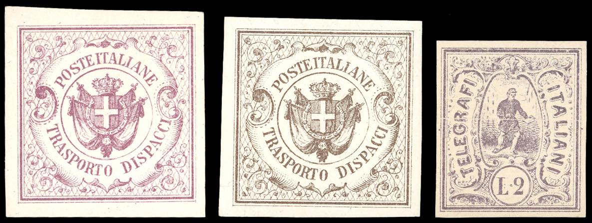 1864 - Saggi Hummel, Trasporto dispacci, due esemplari in colori diversi, e 2 lire Telegrafi italiani (Unificato 53), senza gomma come ... Leggi tutto