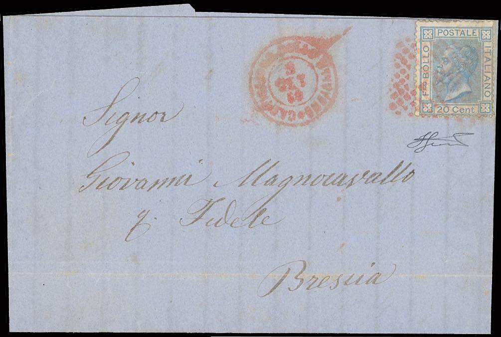 CASTIGLIONE DELLE STIVIERE, numerale rosso - 20 cent. celeste (L26), perfetto, su lettera del 5/9/1867 per Brescia. Rara! Ferrario.
