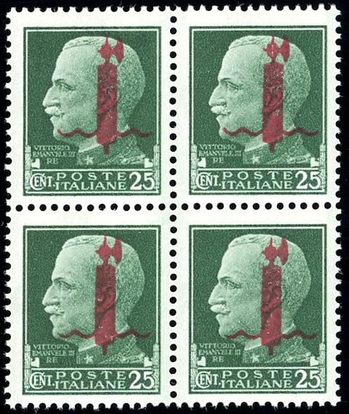 Lotto 1871 - 1944 - 25 cent. soprastampato fascio in rosso (490), blocco ...