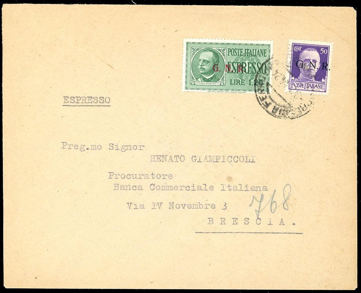 1944 - 1,25 lire soprastampa G.N.R. di Brescia, III tipo, 50 cent. soprastampa G.N.R. di Brescia, I tipo (E19/III,477/I), perfetti, su busta per espresso da Brescia 8/2/1944 per città.