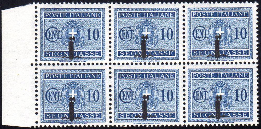 1944 - 10 cent. soprastampa piccolo fascio fortemente spostata in basso (61), blocco di sei, gomma integra, perfetto. Bella varietà, non catalogata su questo valore.