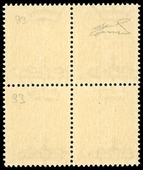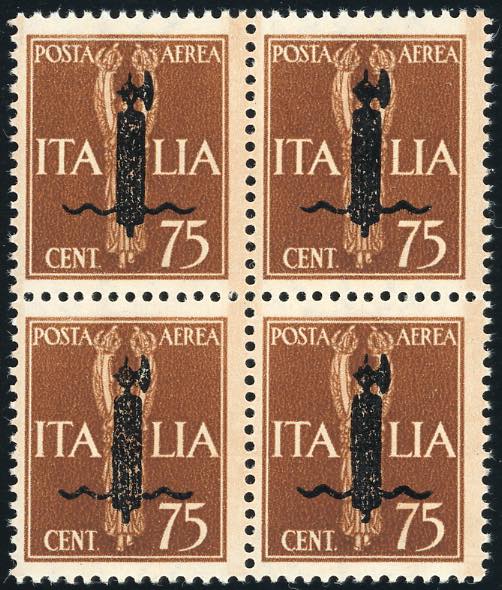 POSTA AEREA 1944 - 75 cent. bruno giallo, soprastampa fascio in nero (P10A), blocco di quattro, gomma originale integra, perfetto. Bello e ... Leggi tutto