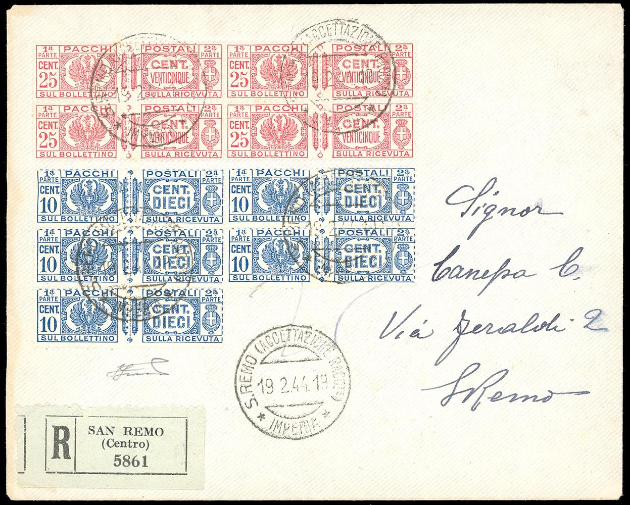 1944 - 10 cent., blocco di cinque, 25 cent., blocco di quattro, pacchi postali (25,26), perfetti, su busta raccomandata da San Remo 19/2/1944 per città. Bella affrancatura d'emergenza. Ferrario.
