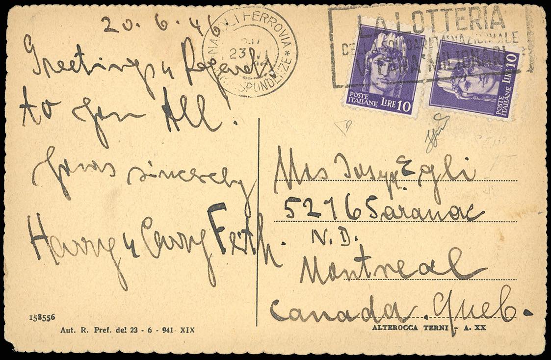 1946 - 10 lire Imperiale, tiratura di Novara senza filigrana (542), due esemplari, uno con ininfluente lievissima piega precedente all'applicazione, su cartolina da Napoli del 23/6/1946 per Montreal in Canada. Non comune l'uso in Repubblica e la destinazione. Ferrario, cert. E.Diena.