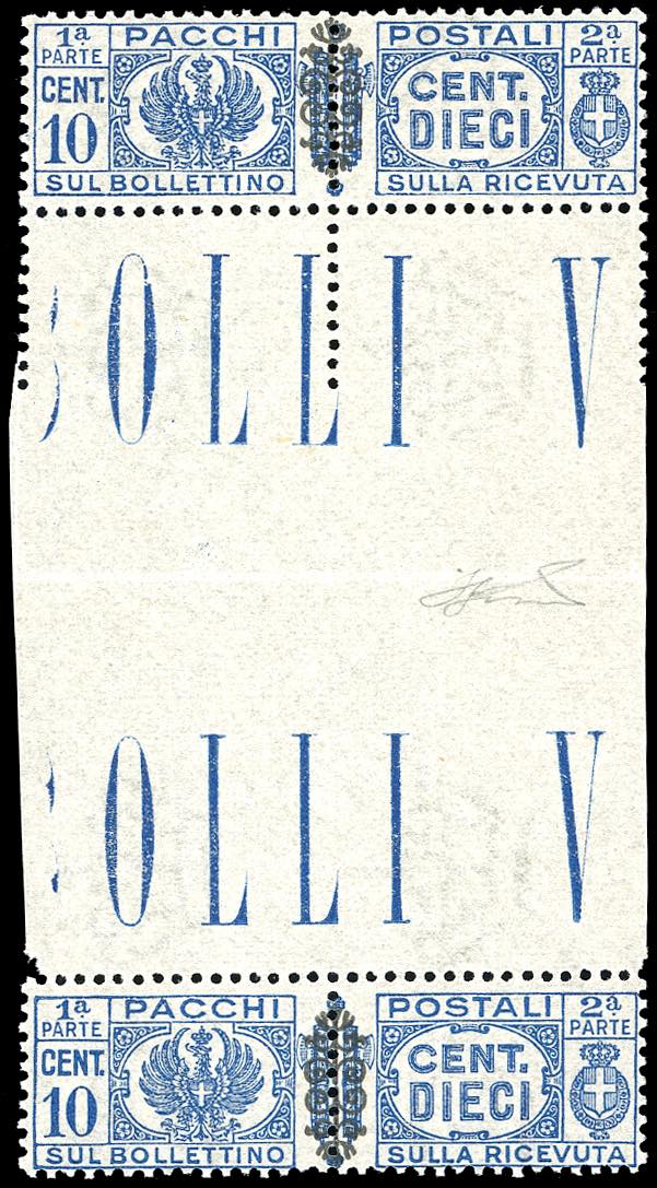 PACCHI POSTALI 1945 - 10 cent. soprastampato (48), coppia verticale con interspazio di gruppo al centro, gomma originale integra, perfetto. Bella e rara. Ferrario.