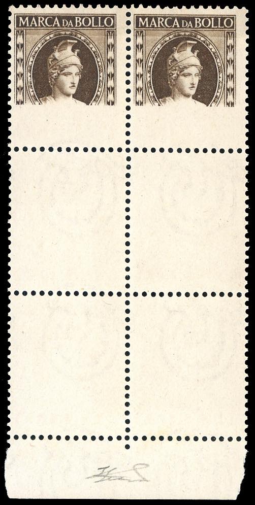 1945 ca - 1 lira Minerva, marca da bollo, blocco di 6, le prime due marche con stampa parziale senza valore facciale, le altre completamente senza stampa, bordo di foglio, gomma originale integra, perfetto. Raro e d'effetto. G.Bolaffi, Ferrario.