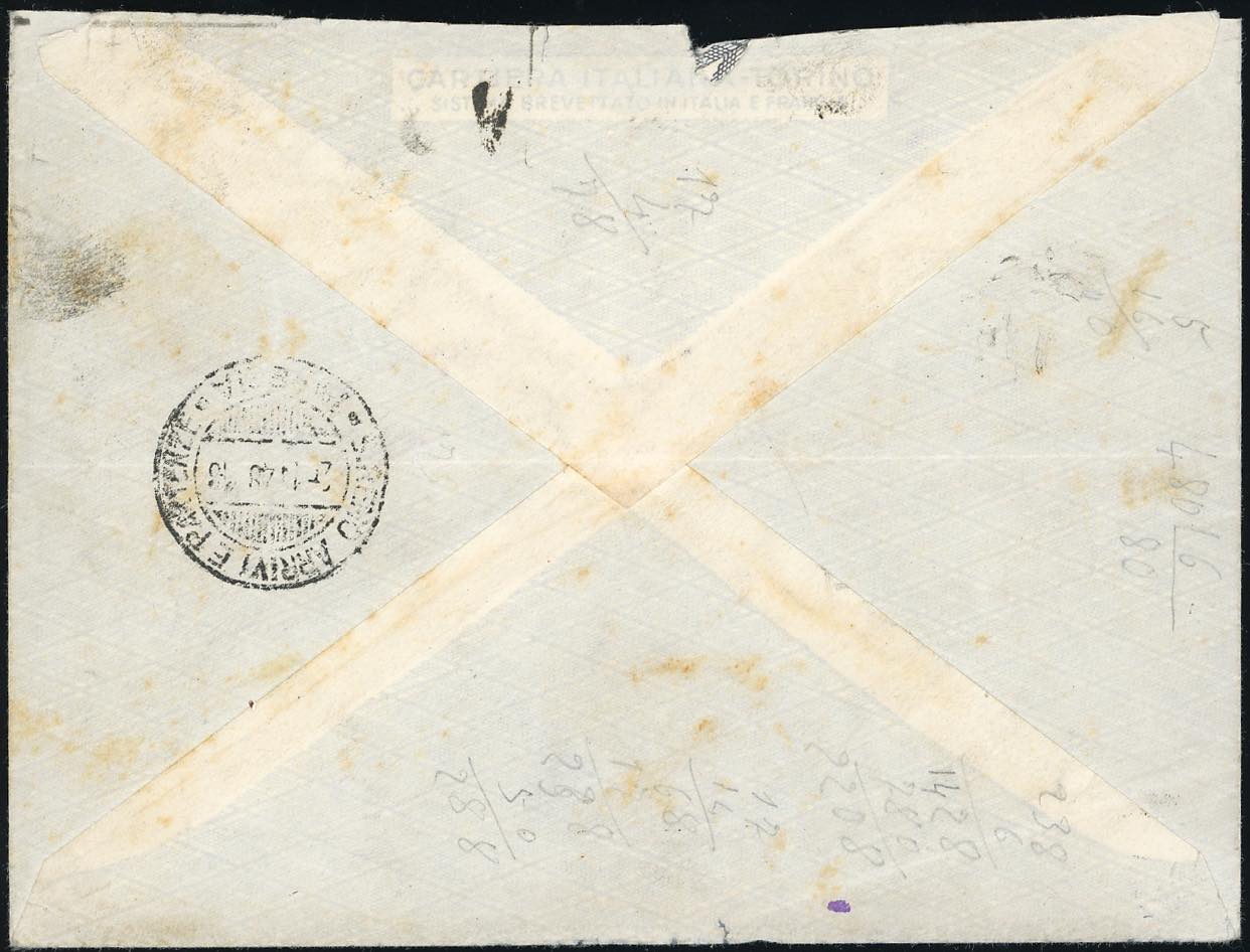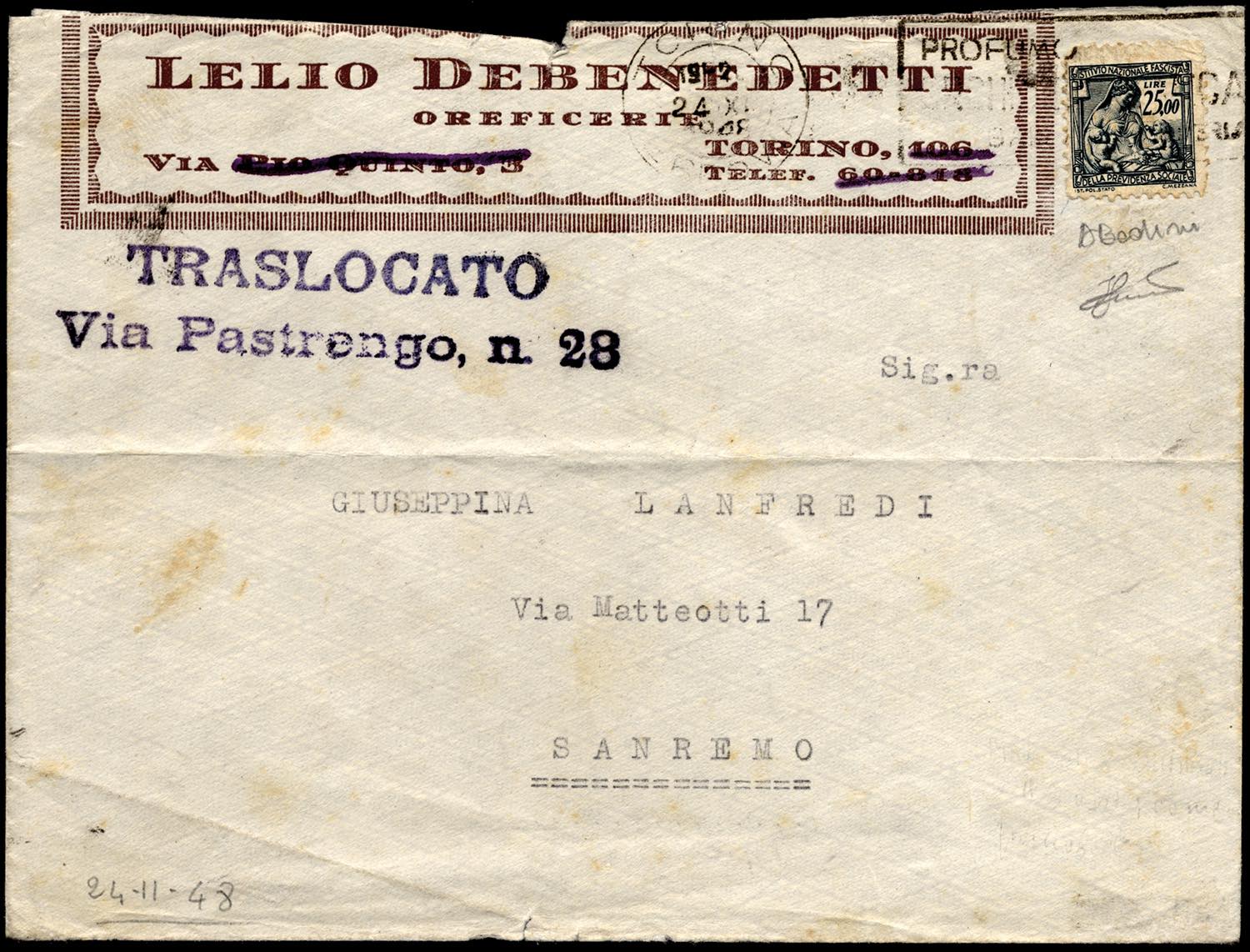 1948 - 25 lire marca da bollo dell'Istituto nazionale fascista della previdenza sociale, difetti di dentellatura, su busta da Torino 24/11/1948 per Sanremo. Eccezionale caso di marca da bollo fascista usata in Repubblica. Probabilmente unica. Bodini, Ferrario.