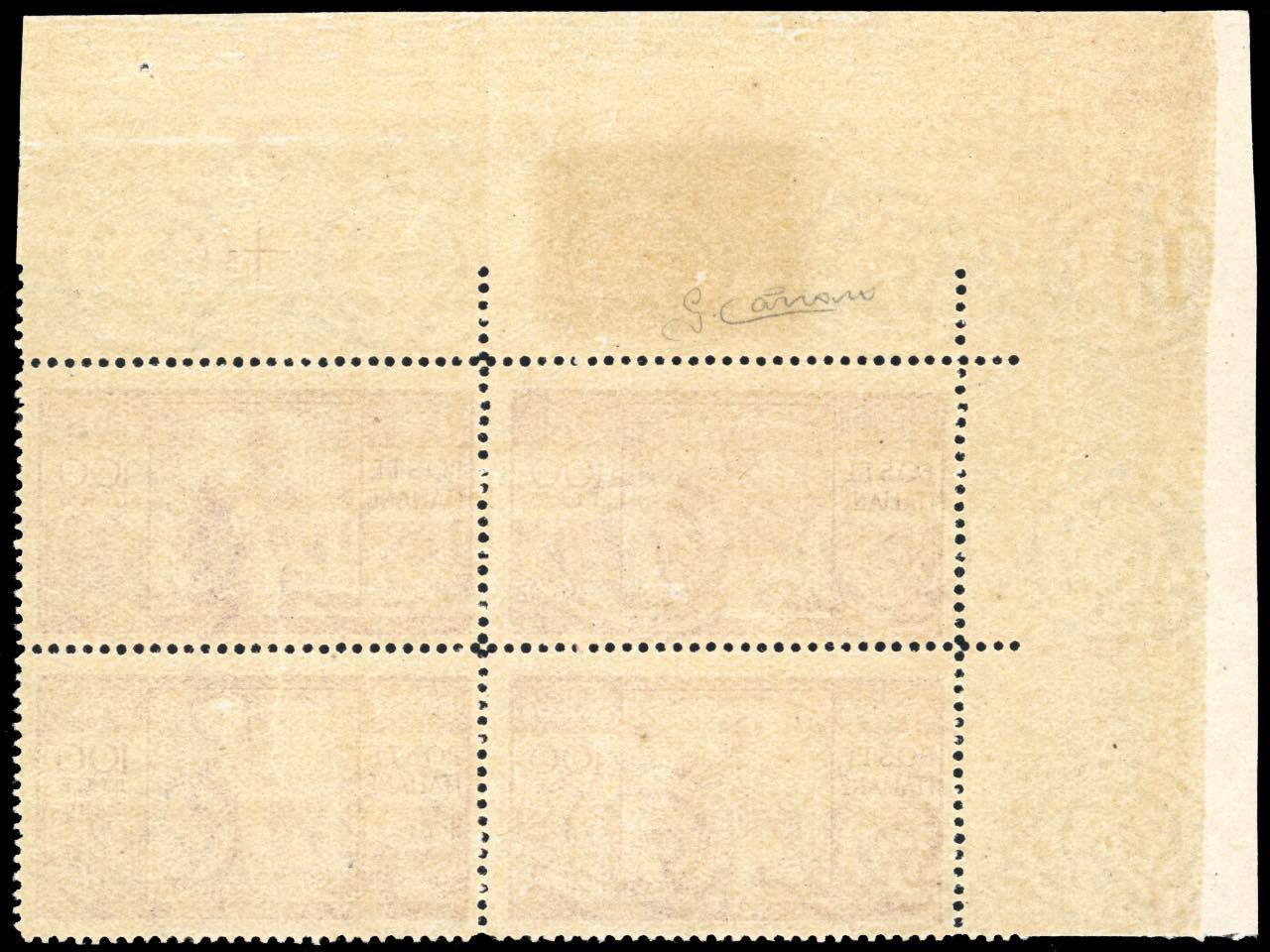 1946 - 100 lire Democratica, I lastra, dent. 14 x 14 1/4, blocco di quattro, angolo di foglio senza diciture, pos. 1-2 e 11-12, doppia ... Leggi tutto