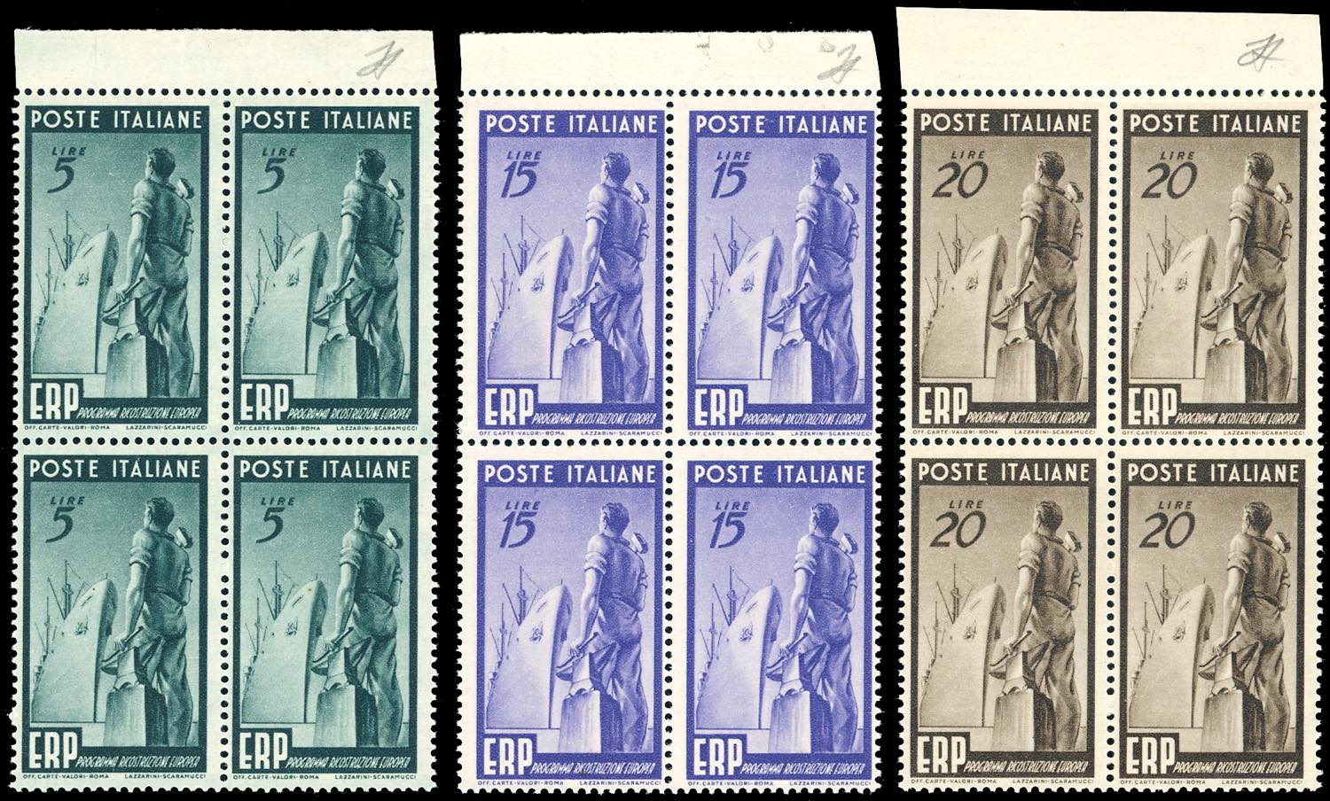 Lotto 2046 - 1949 - ERP, serie completa (601/603), blocchi di quattro, ...