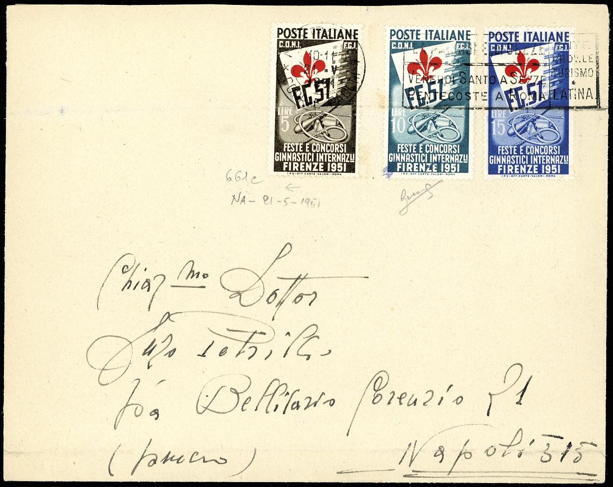 1951 - Ginnici, serie completa (661/663), ottimo stato, su busta con annullo meccanico a targhetta di Napoli 21/5/1951 per città.