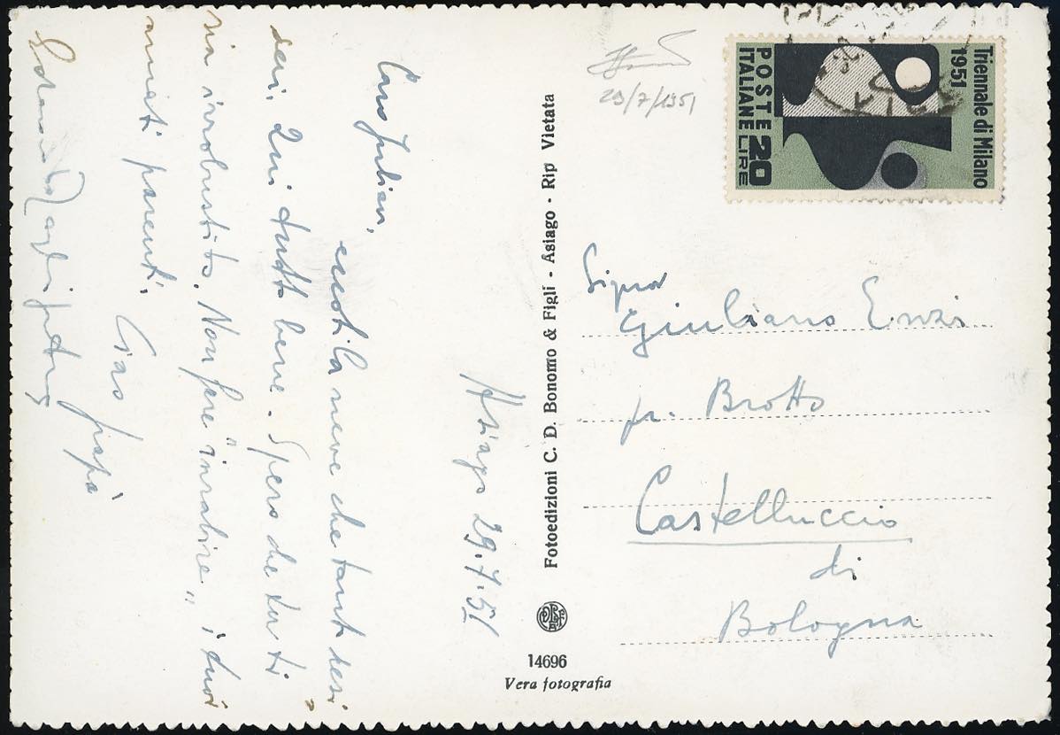 1951 - 20 lire Triennale (666), perfetto, isolato su cartolina scritta ad Asiago 29/7/1951 per Castelluccio di Bologna. Interessante uso isolato entro il 31 luglio 1951. Ferrario.