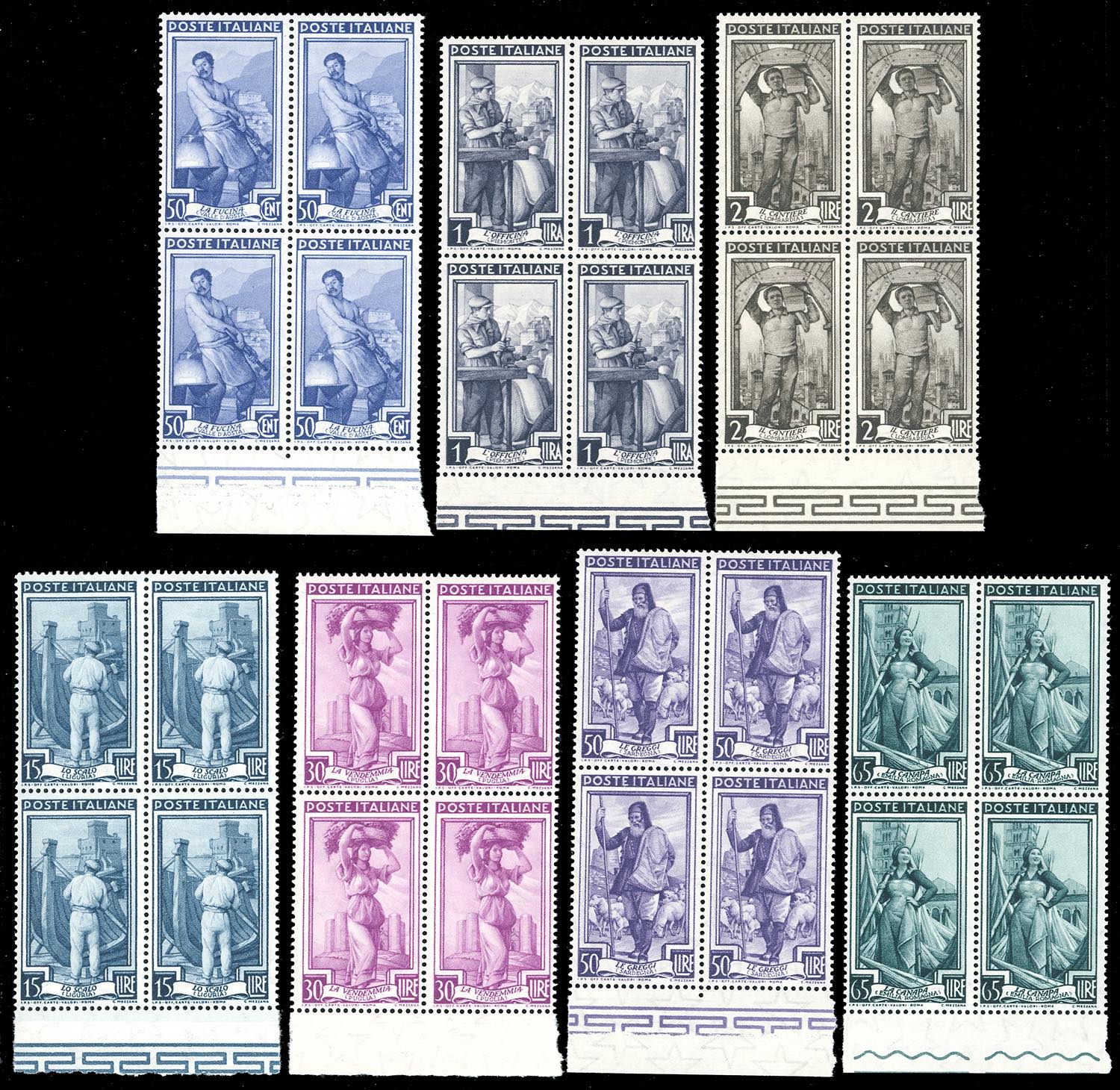 1855/57 - Lavoro, filigrana stelle, serie completa (754/760), blocchi di quattro, bordo di foglio, nuovi, gomma originale integra, perfetti. Ferrario.