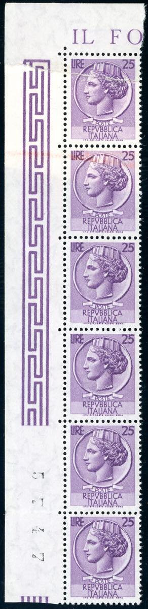 1955 - 25 lire Siracusana, filigrana stelle II tipo, striscia verticale di sei, due esemplari stampati su carta ricongiunta (769/Ih), ... Leggi tutto