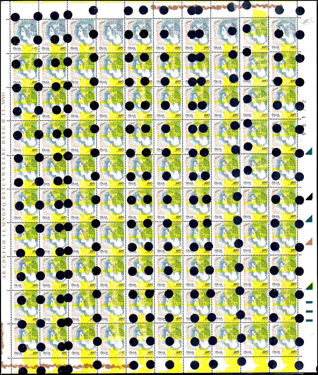 1998 - 100 lire Donne nell'arte, prova di stampa con la cifra 100 cancellata da due sbarrette nere oblique (Sass.spec. P85), stampa del giallo spostata in basso, foglio completo di 100 esemplari, i francobolli della prima riga con stampa del giallo parziale, gomma originale integra, fori di demonetizzazione su tutti i francobolli. Raro. Ferrario.