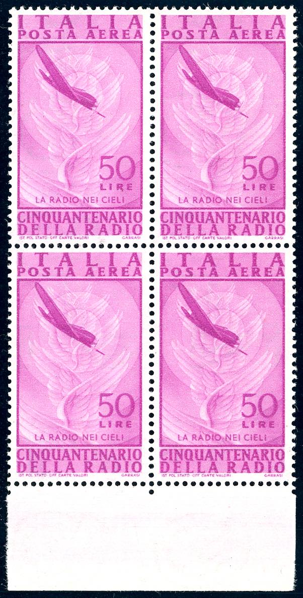 1947 - 50 lire Radio, filigrana SB (141), blocco di quattro, i due esemplari inferiori con filigrana lettere su due righe completa 10/10, bordo di foglio, gomma originale integra, perfetto. Raro.