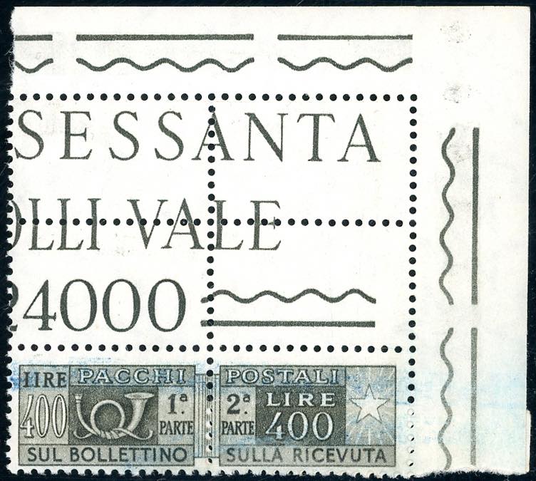 1955 - 400 lire, filigrana stelle IV, carta ricongiunta (97/IIm), angolo di foglio, gomma integra, perfetto, consueti segni di biffatura.