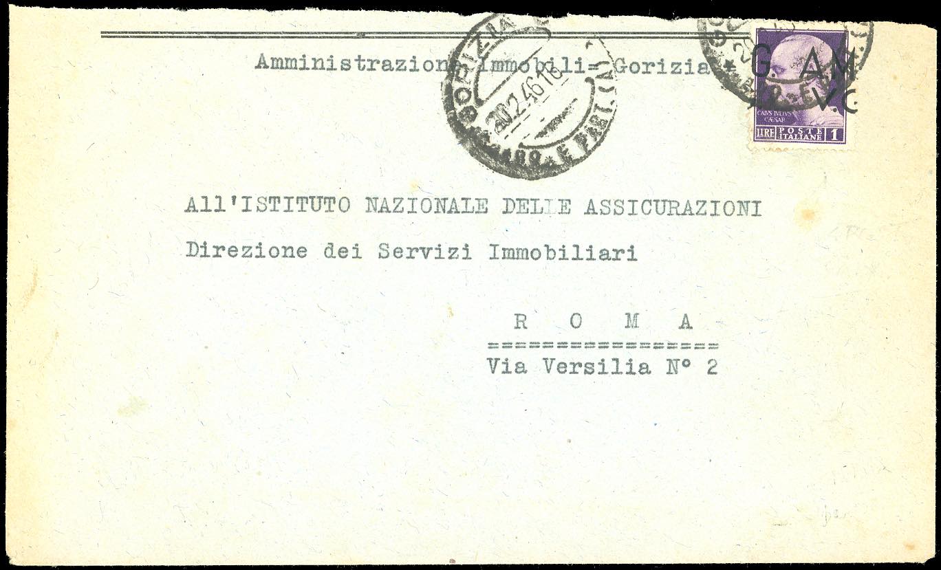 1946 - 1 lira, soprastampa fortemente spostata a destra "G. A.M." (8hl), ottimo stato, su busta, rifilata in alto, da Gorizia 20/2/1946 a ... Leggi tutto