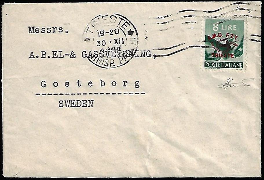 1948 - 8 lire soprastampato Convegno Filatelico (30), perfetto, isolato in esatta tariffa, su bustina stampe, da Trieste 30/12/1948 a Goteborg in Svezia. Rara! Ferrario.