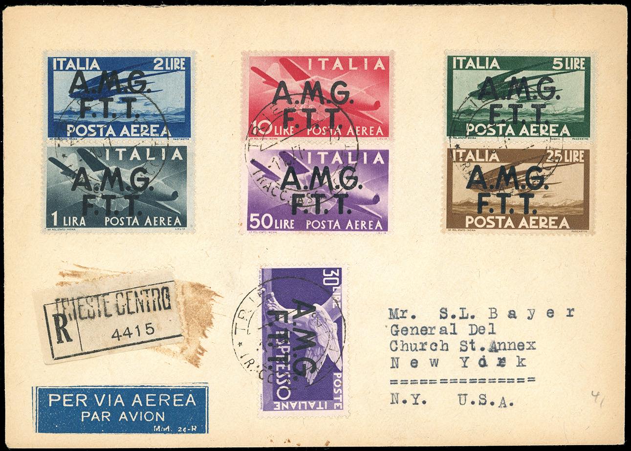 POSTA AEREA 1947 - Soprastampati su due righe, serie completa, e 30 lire espresso (A1/6,E2), perfetti, su aerogramma raccomandato da Trieste 1/10/1947, primo giorno d'emissione, a New York, Stati Uniti. Non comune busta FDC.