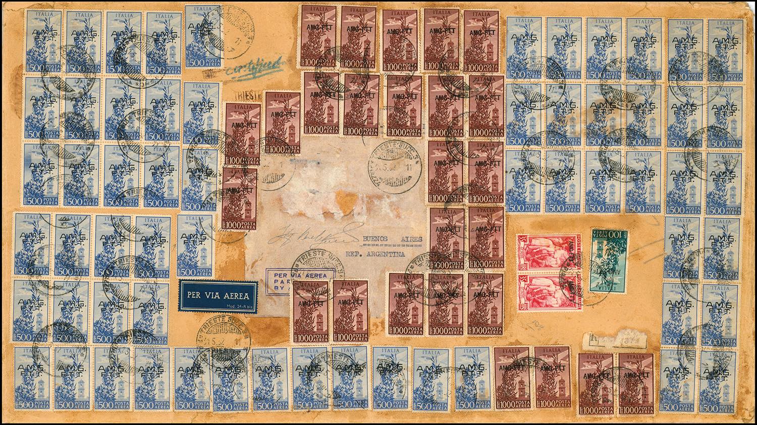 POSTA AEREA 1952 - Spettacolare involucro di plico spedito per raccomandata aerea da Trieste 31/5/1952 a Buenos Aires, affrancato per lire 53.170 con 85 francobolli. l'affrancatura è composta da: 22 esemplari del 1.000 lire Campidoglio, dent. 14 x 13 1/4 (26A), 60 esemplari del 500 lire, soprastampa locale su due righe (15), 100 lire Campidoglio (23) e coppia del 35 lire Lavoro (100). Si tratta della MASSIMA AFFRANCATURA ESISTENTE DELLA COLLEZIONE DEL TERRITORIO LIBERO DI TRIESTE, nonché una delle massime affrancature all-time di tutta l'Area Italiana. Grande rarità! Ferrario, cert. Enzo Diena.