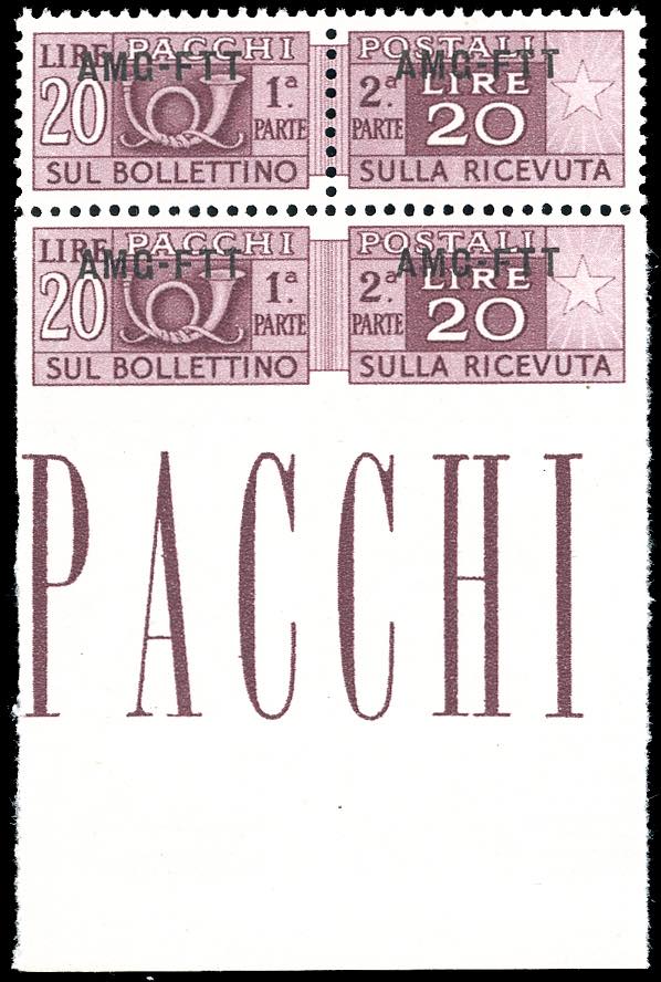 PACCHI POSTALI 1949 - 20 lire, soprastampa su una riga, coppia verticale, l'esemplare inferiore dentellato solo in alto (19n), bordo di foglio, gomma originale integra, perfetto. Ferrario.