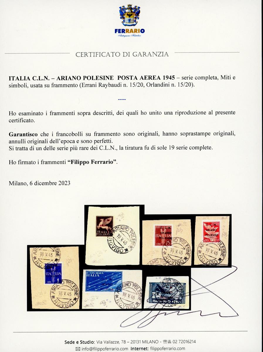 ARIANO POLESINE POSTA AEREA 1945 - Miti e simboli, serie completa, soprastampati (Errani Raybaudi 15/20,Orlandini 15/20), usati su frammento, annulli originale dell'epoca, perfetti. Bellissimi. Una delle serie più rare dei C.L.N., tiratura 19. Cert. Ferrario e Oro Raybaudi.