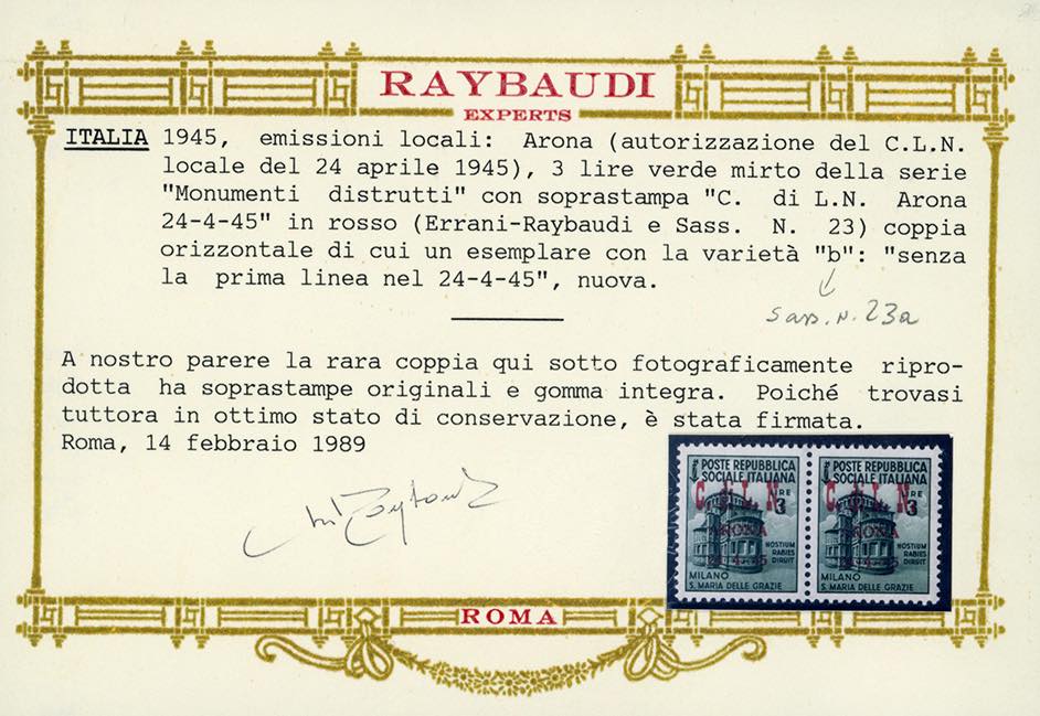 ARONA 1945 - 3 lire Monumenti Distrutti, soprastampa rossa, coppia orizzontale, il primo esemplare senza il trattino tra 24 e 4 (23+23a), ... Leggi tutto