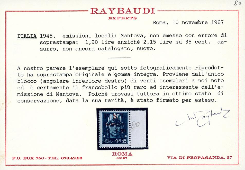 MANTOVA 1945 - 1,90 su 15 cent. e 1,90 su 35 cent. soprastampati, errore di valore (2A,3A), nuovi, gomma originale integra, perfetti. Molto belli e rari. Ferrario, cert. Raybaudi.