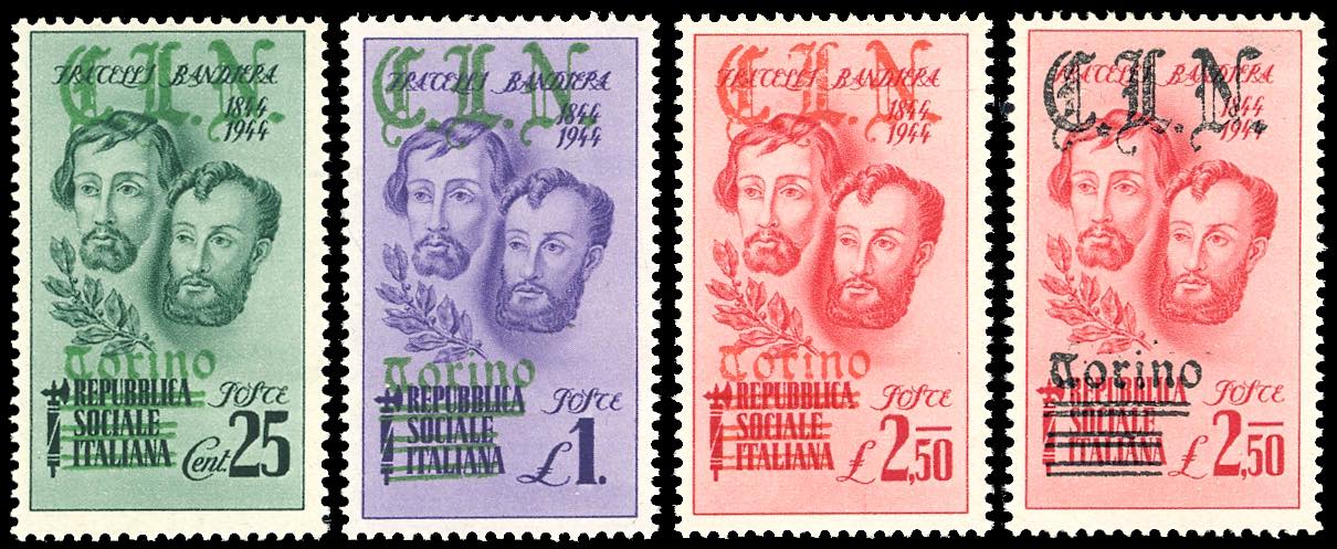 TORINO 1945 - Fratelli Bandiera, 25 e 50 cent. soprastampa verde, anziché rossa, 2,50 lire due esemplari, uno con soprastampa rossa, anziché verde, l'altro con soprastampa nera, anziché verde (Errani Raybaudi vedi nota,CEI P32/P34, UNIFICATO 14e,15e,16f,16g), nuovi, gomma originale integra, perfetti. Allestiti a titolo di prova. Rarissimi, pochi esemplari esistenti, probabilmente tiratura 50. Cert. Ferrario e Raybaudi.