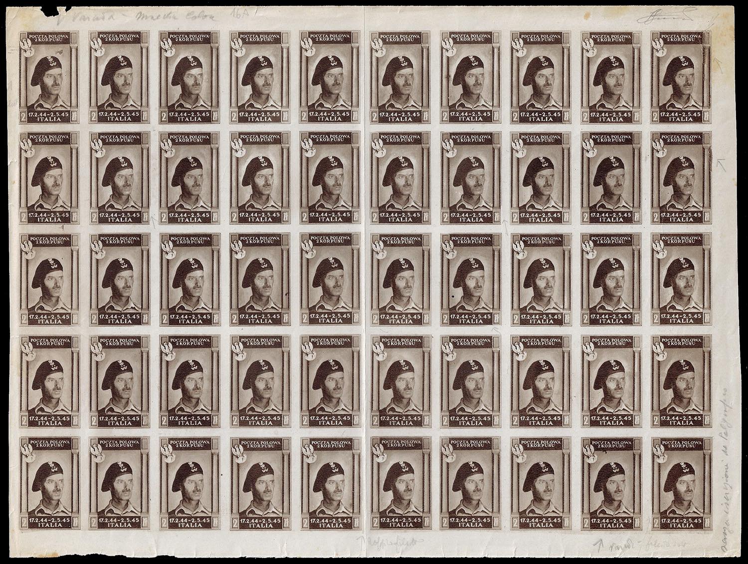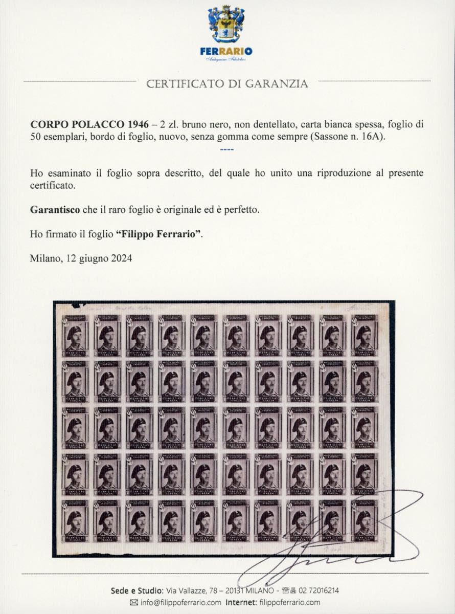 1946 - 2 zl. bruno nero, non dentellato, carta bianca spessa (16A), non gommato come sempre, foglio nuovo di 50 esemplari, perfetto. Sono presenti alcune varietà finora non catalogate. Insieme eccezionale. Cert. Ferrario.