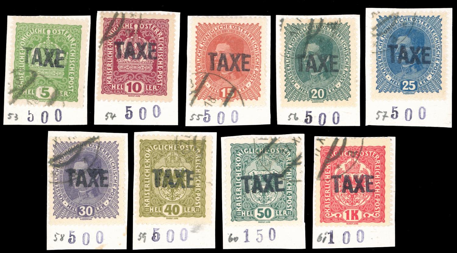 TRENTINO ALTO ADIGE-SEGNATASSE BOLZANO 1918/19 - Francobolli d'Austria soprastampati "taxe" in orizzontale, serie completa (BZ3/23-BZ3/31), usati, perfetti.