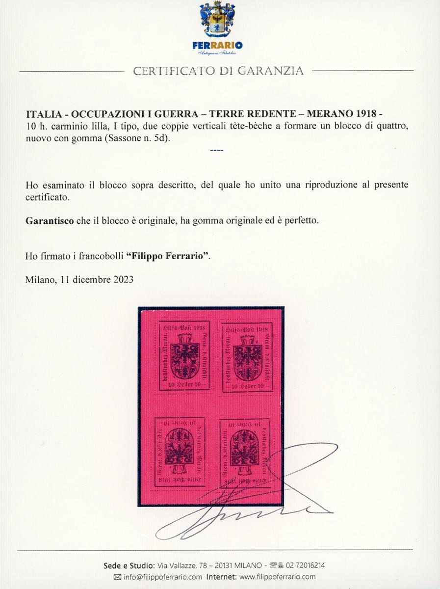 MERANO 1918 - 10 h. carminio lilla, I tipo, due coppie verticali tète-bèche a formare un blocco di quattro (5d), nuovo, gomma originale, lieve linguella, perfetto. Cert. Ferrario.