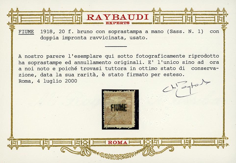 FIUME 1918 - 10 f. soprastampato "FIUME" a mano, doppia soprastampa (1a), usato, perfetto. Si tratta dell'UNICO ESEMPLARE NOTO di questa varietà. Ferrario, G.Oliva, cert. Oro Raybaudi.