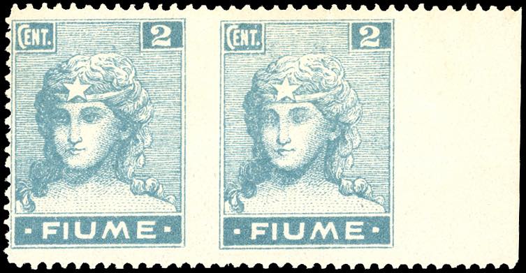 FIUME 1919 - 2 cent. Allegorie e Vedute, carta C, coppia orizzontale non dentallata al centro e a destra (C32ha), bordo di foglio, nuova, ... Leggi tutto