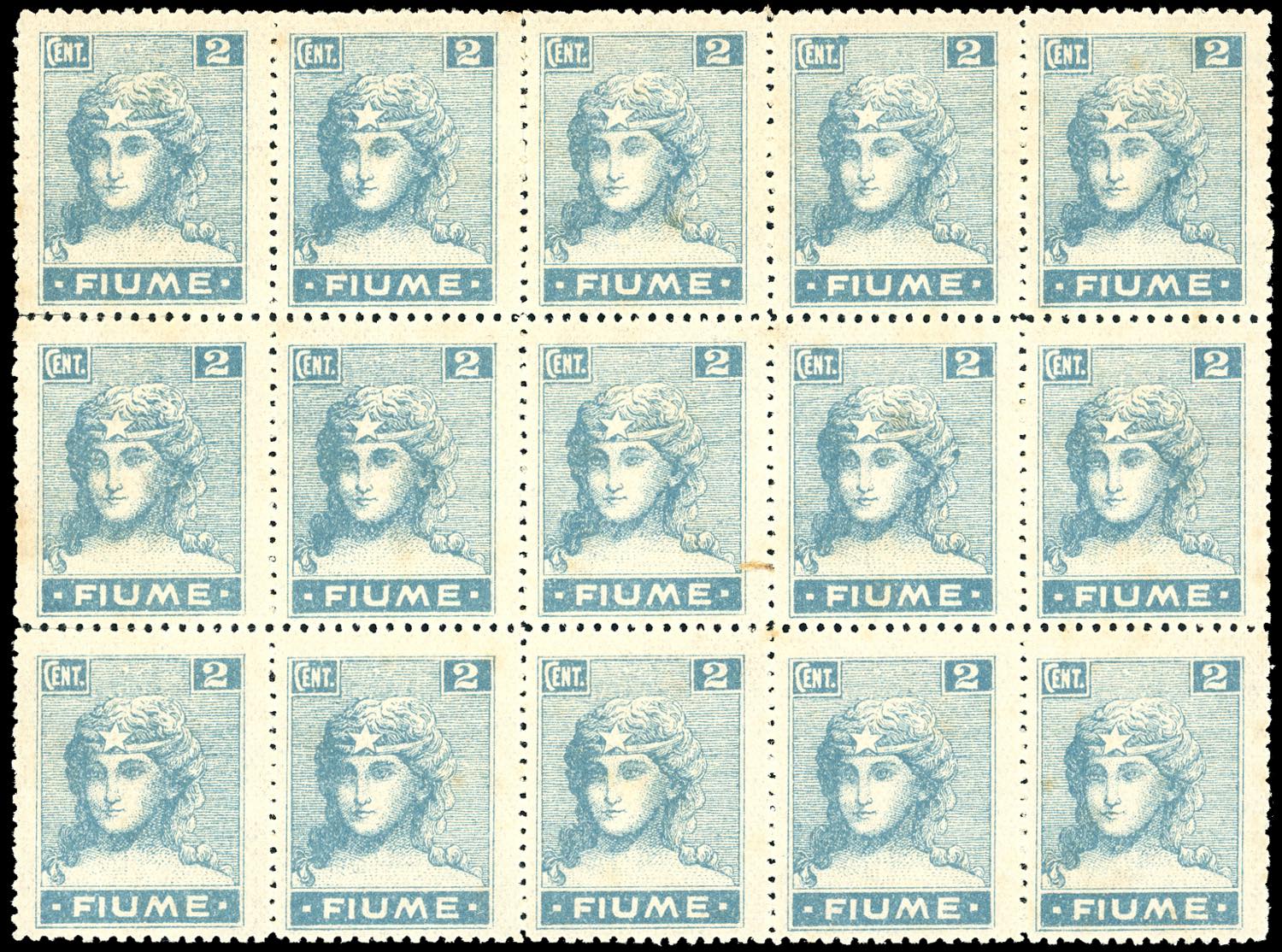 FIUME 1919 - 2 cent. Allegorie e Vedute, carta C, decalco obliquo al verso (C32n), blocco di 15 esemplari, nuovo, gomma originale integra, perfetto, lievi ossidazioni.