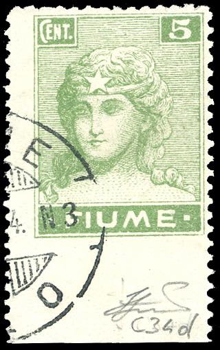 FIUME 1919 - 5 cent. Allegorie e Vedute, carta C, non dentellato in basso (C34d), bordo di foglio, usato, perfetto. Ferrario.